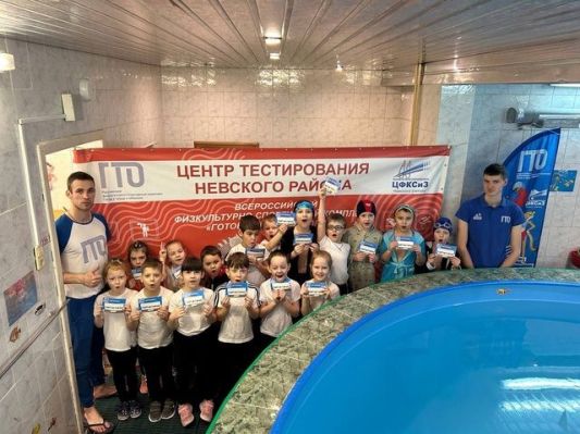 Под руководством инструктора по физическому воспитанию детям была проведена разминка. Чтобы получить золотой знак отличия ГТО мальчики и девочки должны были проплыть 25 метров.