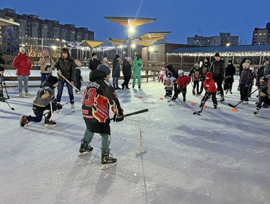 На празднике юные фигуристы и хоккеисты, воспитанники спортшколы №1, продемонстрировали на уличном катке «Железный лёд» свои умения и помогли малышам освоить катание на коньках.