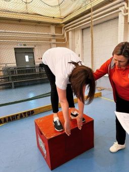 Участники соревновались в прыжках в длину с места, поднимании туловища, наклоне вперёд стоя на гимнастической скамейке,...