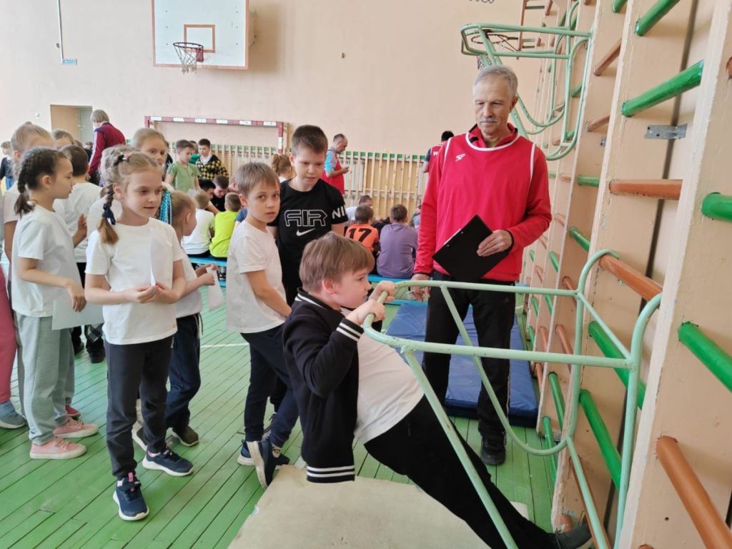 Ребята выполнили подтягивания, отжимания, наклоны вперед на гимнастической скамье, поднимание туловища из положения лежа, челночный бег 3х10 м и прыжки вперед.