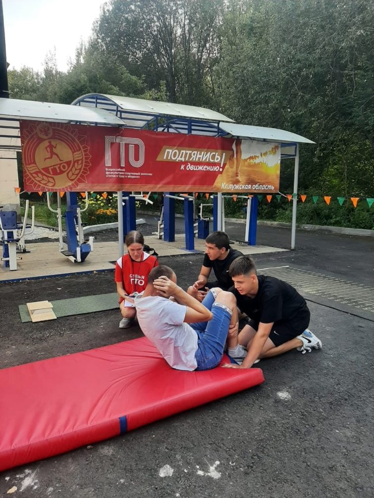На площадке были представлены следующие виды испытаний: наклон вперед, рывок гири, поднимание туловища, прыжок в длину с места, сгибание и разгибание рук в упоре лежа.
