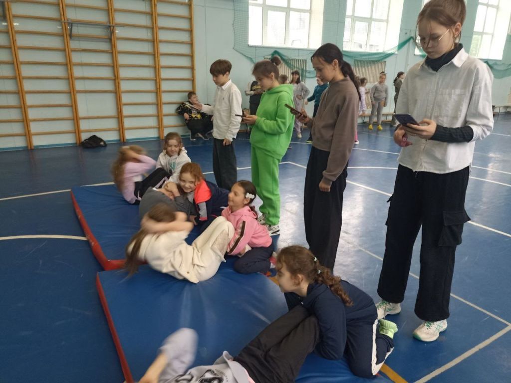 Ребята 1-4 классов с энтузиазмом приступили к выполнению нормативов. Они выполняли пресс, челночный бег и отжимания, демонстрируя свою физическую подготовку и стремление к победе.